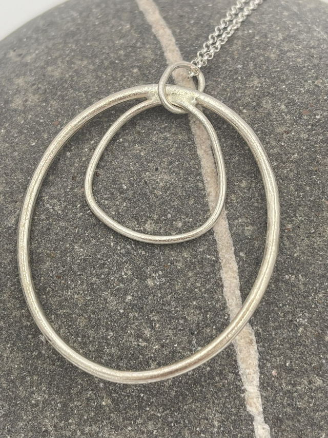 The silver circles are handcrafted from silver wire and soldered together a silver ring has been attached enabling it to be strung from the chain of your; choice.